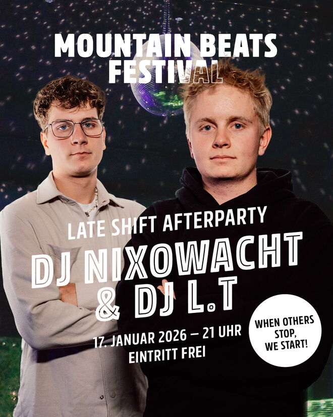 The Mountain Beats Festival is entering its third round and the party continues! The Mountain Beats After Party in your Revier with DJ NIXOWACHT & DJ L.T